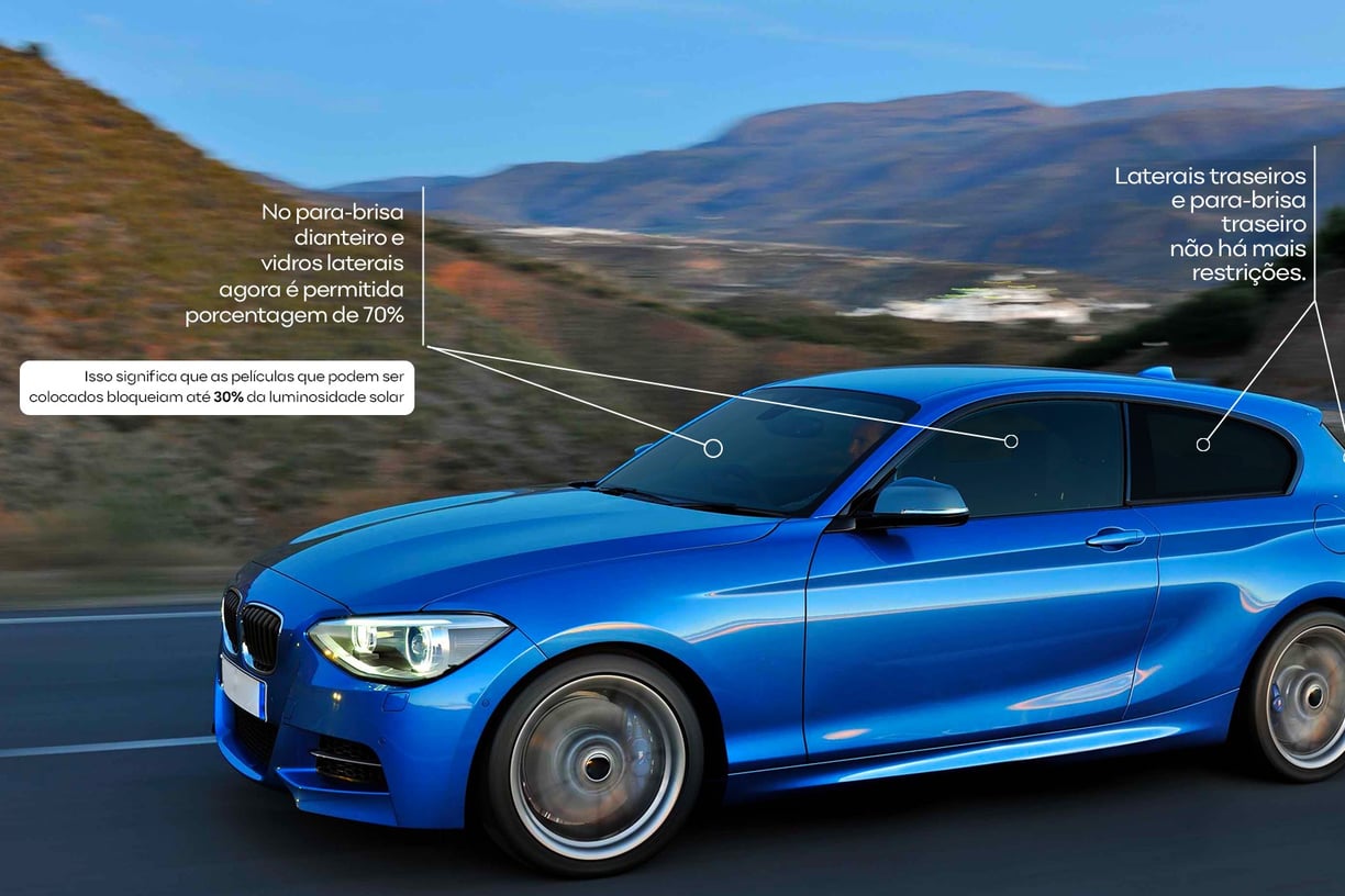 No para-brisa dianteiro e vidros laterais a transmissão luminosa não poderá ser inferior a 70%, e nos demais vidros (laterais traseiros e para-brisa traseiro) não há mais restrições. Ou seja, agora é possível colocar película até 30% nos vidros dianteiros, enquanto nos demais vidros não há mais limitações